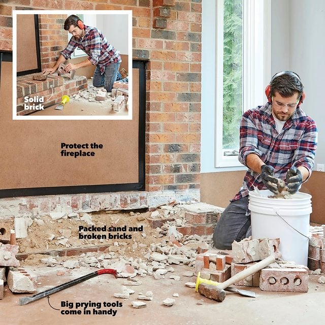 - After peeling away the first layer, I thought the hearth was solid brick. But as I kept chipping, I found packed sand, broken bricks and even an old soda can holding up the rest of the bricks.