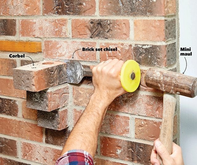 - After removing the mantel (ours wasn’t even fastened), chip out the corbels with a maul and a brick set chisel.