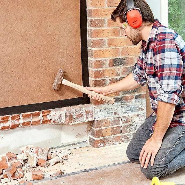 - With a brick set chisel and a maul, start chipping away at the corner of the hearth.