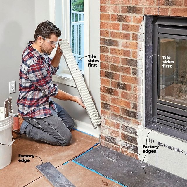 - Tile the sides first so the tile edges will be covered by the tiles on the face of the fireplace.