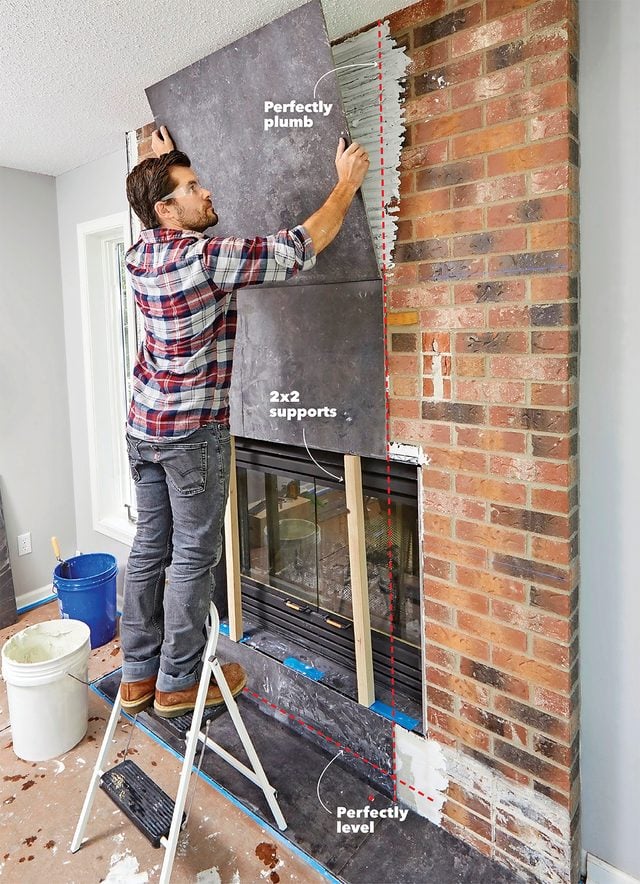 Family Handyman’s first cover story was “How to Repair a Brick Fireplace,” and we’ve been serving up fireplace projects ever since. We showed how to cover brick with tile way back in 1953. Since then, better tools and materials have made it much easier for DIYers to tackle a project like this. Tile manufacturing has improved too, with more choices available, like the large tiles we used for our modern fireplace makeover.