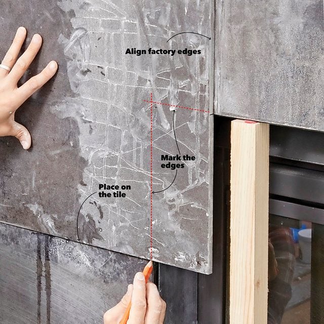 Cutting the tile around the fireplace is tricky. If the tiles don’t line up, you’ll notice, so precise cuts are important.