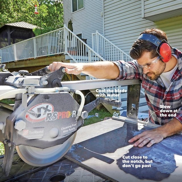 - Pro tip: For notches, start with the tile saw and use an angle grinder or tile nippers to finish the cut.